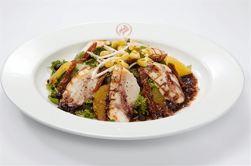 Place the prepared salad on a plate, surround it with sliced chicken fillet and orange wedges, top with soybean sprouts, and sprinkle with dried tomatoes.