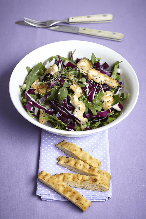 Place the salad mix on a plate, top with pieces of chicken and garlic croutons (you can serve whole garlic bread alongside).