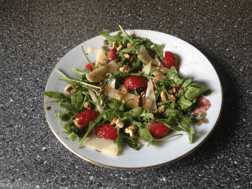 Place arugula, sliced strawberries, and shaved parmesan on a plate. Season with salt and pepper and lightly toss.