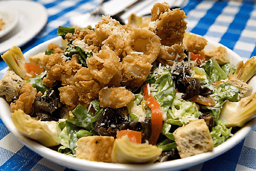 Caesar salad with shrimp and Worcestershire sauce is an exquisite version of the classic American dish. Its origin dates back to 1924 when Italian chef Caesar Cardini created the original recipe. In this version, shrimp infused with soy, barbecue, and Worcestershire sauces add a zesty flavor. Crispy garlic and cheese croutons perfectly complement fresh lettuce leaves, while the dressing of olive oil, lime, and wine vinegar adds a light tanginess. Parmesan gives the dish completeness, while salt and pepper enhance the taste. This salad is for those who appreciate a balance of freshness and rich aromas, making it ideal for both a light dinner and a festive table.