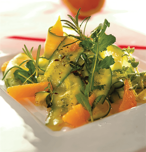 Cucumber salad with fresh herbs, orange slices and zest