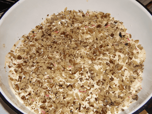The top can be decorated with crushed and roasted walnuts. They add a spicy flavor, and the salad looks beautiful.