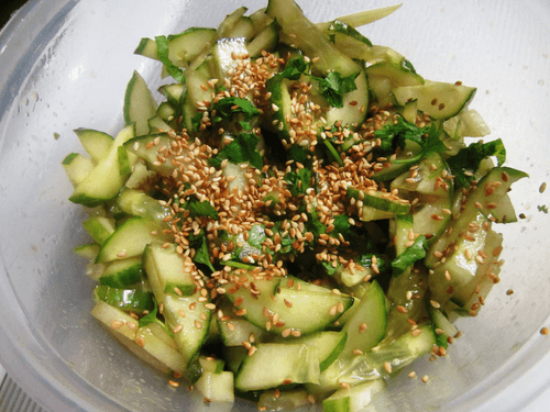 Mix cucumbers with sauce, add cilantro, and sprinkle sesame on top.