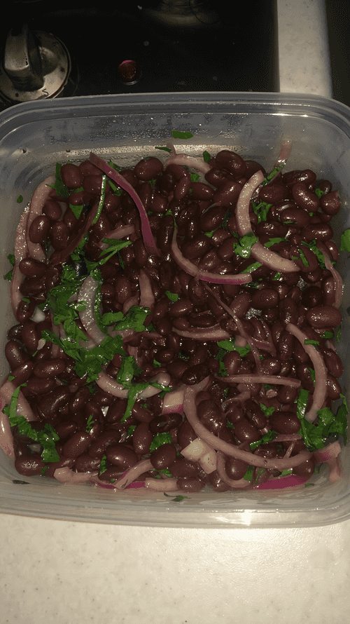 In a bowl, mix beans, parsley leaves, olive oil, vinegar, and thinly sliced red onion.