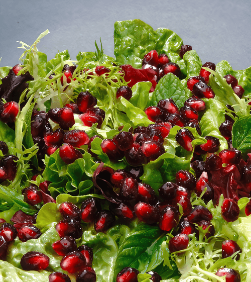 Place salad leaves and pomegranate seeds in a large bowl. Drizzle with vinaigrette and mix.