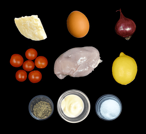 Then layer all the ingredients in the following order: chicken, eggs, cheese, tomatoes with onions. Each layer (except the top) is spread with mayonnaise.