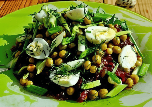 Seaweed and quail egg salad is a refined combination of sea and land ingredients born in Russian cuisine. Seaweed, rich in iodine and beneficial microelements, gives the dish a fresh, slightly salty taste. Tender quail eggs add softness, while boiled beetroot contributes a light sweetness and vibrant color. Canned green peas bring a touch of freshness, and onion rings add a mild spiciness. Olive oil ties all the ingredients together, enhancing their flavors. This salad is perfect as a standalone dish or as a side for fish and meat dishes. It is nutritious, light, and healthy, fitting well into both everyday and festive menus.