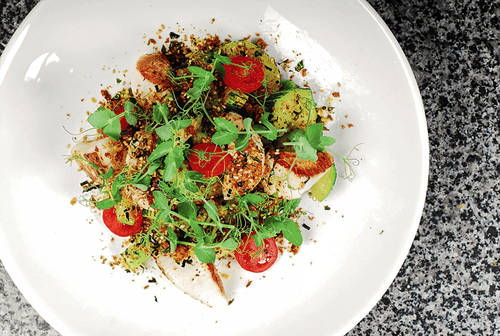A salad of vegetables and scallops, the highlight of which is the mixture of Japanese spices with which they are generously sprinkled