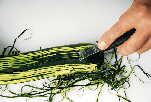 Peel the zucchini. Summer vegetables have soft and fresh skin, which can be left on, but winter ones are already bitter. A zester can be used for peeling, leaving beautiful strips resembling watermelon. Cut the zucchini in half, scoop out the core, and slice the remaining flesh into one-centimeter thick pieces.