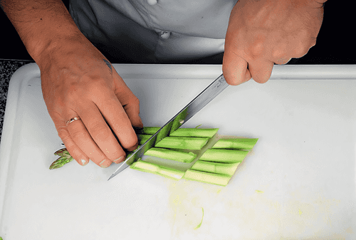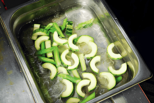Boil a liter of water in a saucepan, add a little salt, and blanch the vegetables: asparagus for three to four minutes, zucchini for about two. Use a slotted spoon to transfer the vegetables to ice water and let them sit for a couple of minutes to stop the cooking and set the color. Dry on paper towels.