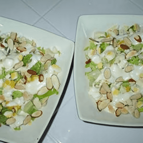 Blue cheese salad is an exquisite dish of French cuisine that harmoniously combines tenderness and rich flavor. Blue cheese, known for its pungent aroma and creamy texture, perfectly complements the fresh crunchy romaine salad. Roasted almonds add a pleasant crunch, while the creamy dressing provides softness and depth of flavor. Historically, blue cheese was popular among the French nobility, and its pairing with greens made it part of gastronomic heritage. This salad not only decorates the table but is also perfect for special occasions or a light dinner. Its rich and balanced taste awakens the appetite and leaves a pleasant aftertaste.