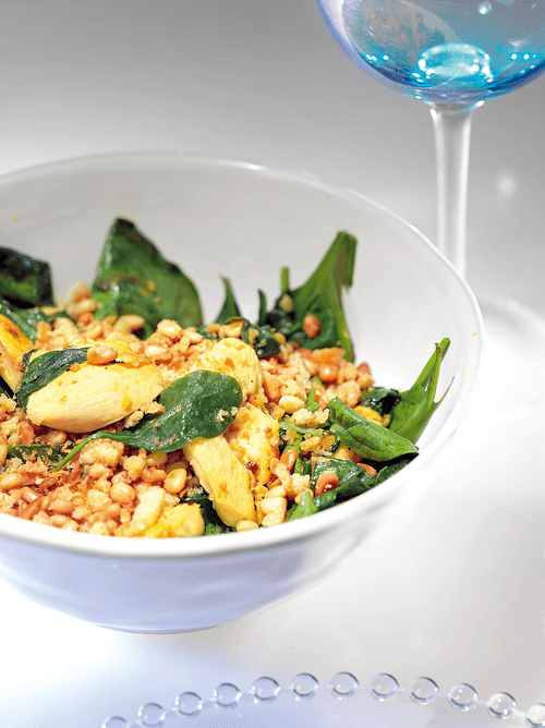 A fresh, tender salad where the chicken is contrasted with lightly fried spinach. While frying the chicken, throw a pinch of turmeric into the pan - just for color.
