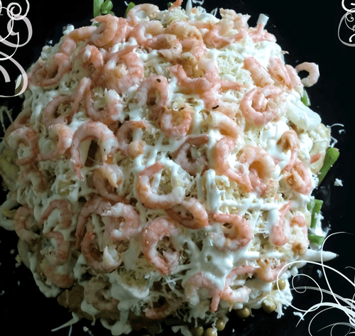 The next layer is half boiled and peeled shrimp, mayonnaise. Repeat all layers again and decorate as desired.