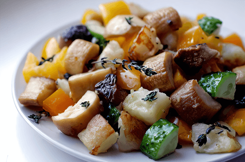 Warm salad with king oyster mushrooms, fried potatoes and thyme