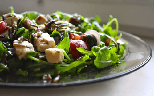 In a deep bowl, mix arugula, rice, cheese, onion, and cherry.