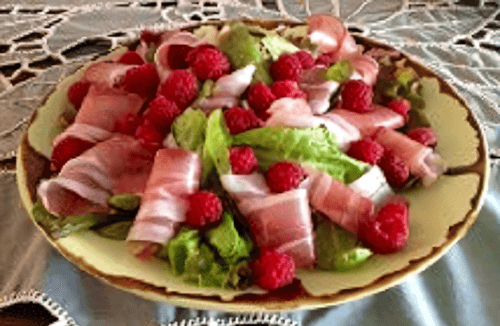 Summer salad with prosciutto and raspberry is a refined dish of Italian cuisine that combines lightness and sophistication. Its origin is linked to the tradition of Mediterranean chefs who value the balance of freshness and rich flavors. The sweet juiciness of raspberries harmonizes with the savory saltiness of prosciutto, while arugula adds a spicy bitterness. Balsamic vinegar completes the picture, enriching the dish with a rich aroma. This salad is perfect for a summer dinner or light lunch, creating a sense of freshness and gastronomic delight. It is served in the best restaurants in Italy and has become popular among gourmets worldwide.