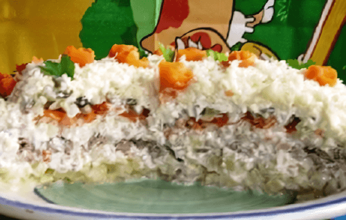 Cucumber and carrot salad is a bright reminder of the simplicity and sophistication of Soviet cuisine. It is based on fresh vegetables that provide a crunchy texture and lightness. Tender boiled sausage adds richness, while grated cheese completes the composition with softness and depth of flavor. The garlic mayonnaise dressing gives the dish spiciness and aromatic richness. This salad is great as a standalone dish or as a side to meat or fish delicacies. It is perfect for family dinners or festive gatherings, delighting guests with its balanced texture and appetizing appearance. The simplicity of preparation makes it accessible even for culinary beginners, while the harmonious combination of ingredients leaves a pleasant gastronomic impression.