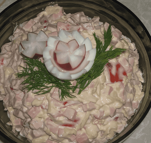 Salad with sausage and cheese is a simple and hearty dish from Russian home cooking. It harmoniously combines the softness of doctor sausage, the juiciness of ripe tomatoes, and the spiciness of garlic. The delicate cheese adds a creamy touch to the dish, while mayonnaise brings all the flavors together, creating a pleasant texture. This salad is perfect as an appetizer on a festive table or as a quick snack in everyday life. Its ease of preparation makes it popular among hostesses who appreciate tasty and practical dishes. It pairs especially well with rye bread or fresh green leaves, adding freshness and contrast. Its simple yet expressive flavor makes this salad a universal choice for any meal.