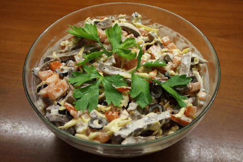 This salad with beef tongue, tomatoes, and Dutch cheese is an exquisite combination of tender meat, juicy vegetables, and the piquant notes of olives. The tongue, being a delicacy of European cuisine, adds a rich flavor to the dish, while the combination with grated cheese and fresh tomatoes makes it balanced and appetizing. The mayonnaise dressing adds a creamy texture that binds the ingredients together. This salad is perfect for both festive tables and everyday dinners, delighting with its noble taste and unusual combination of components.