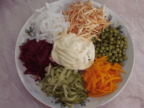 In the center of the plate, we pile the meat, pour mayonnaise on it, and arrange the other ingredients in a circle.