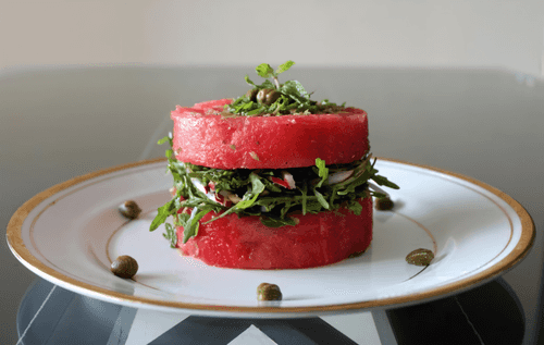 Place a 10 cm diameter culinary ring in the center of the serving plate. Lay a disc of watermelon at the bottom, then 1/3 of the arugula and radish mixture, cover with a second watermelon disc, and remove the ring. Use 1 teaspoon of capers to garnish the salad. Prepare two more portions similarly.
