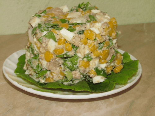 Salad of cod liver and corn is an exquisite combination of tender, velvety cod liver with its marine flavor and sweet, crunchy corn. In Europe, cod liver has long been valued for its health benefits as it is rich in omega-3 fatty acids and vitamins. Adding boiled eggs makes the dish more filling, while fresh salad leaves give it lightness and freshness. This salad is perfect for a festive table but can also be a great option for a light dinner. Its taste unfolds in a delicate balance of salty and sweet, soft and crunchy, making it a true culinary delight. The simplicity of preparation makes it accessible even for novice cooks.