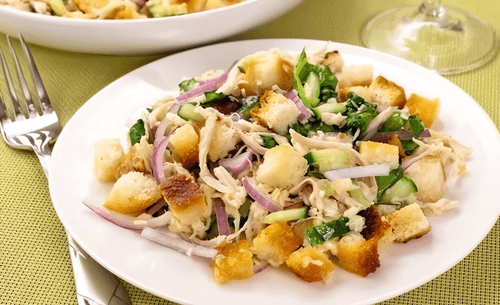 Crispy chicken salad with cucumbers and croutons