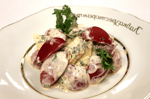 Tomato salad with adjika is a bright and aromatic dish of Georgian cuisine, where fresh tomatoes combine with spicy adjika and tender suluguni. The origins of this salad trace back to the culinary traditions of the Caucasus, where spicy seasonings and fresh vegetables create a harmony of flavors. Adjika adds piquancy to the dish, while basil and cilantro add notes of freshness. The sour cream sauce softens the spiciness of the spices, balancing the taste. This salad is perfect as an appetizer for main dishes or as a light snack on its own. It complements meat dishes and kebabs wonderfully and is an excellent choice for a summer dinner. Its simplicity in preparation makes it accessible even for culinary beginners, while its rich flavor bouquet will make you love it from the first forkful.