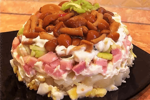 Salad with pickled mushrooms and ham is a true embodiment of Russian cuisine, combining simplicity and richness of flavors. Pickled mushrooms add a slight sourness and spiciness, green onions refresh it, and ham adds heartiness. Boiled potatoes make the dish more tender, while eggs provide softness and enrich the texture. Layers soaked in mayonnaise unite all ingredients into a harmonious ensemble. This salad is often prepared for festive gatherings as its unusual presentation upside down delights guests. It pairs excellently with meat and vegetable dishes and also serves well as a standalone treat. It resembles traditional Russian layered salads but stands out with its original combination of ingredients, creating a rich and balanced taste.