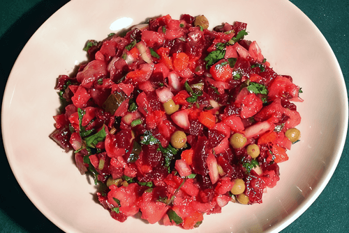 Grate onion, cucumber, carrot, potato, and beet on a coarse grater. Add cabbage. Season with salt and pepper. Dress the vinaigrette with oil and vinegar or lemon dressing.