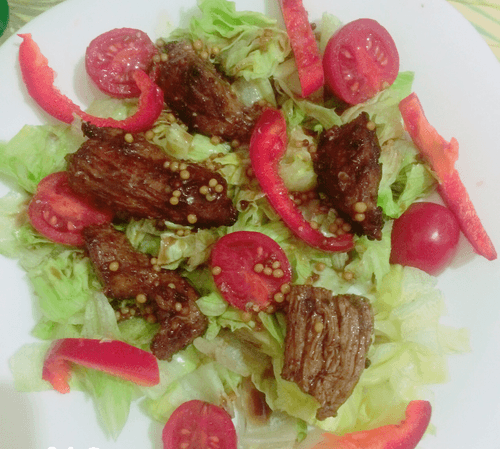 Place the salad on a flat plate. Top the vegetables with pieces of beef.