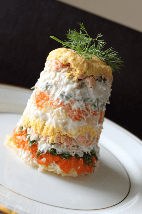 Portion salad 'Mimosa' with salmon is an elegant variation of the classic Russian salad, named for its airy texture and bright colors reminiscent of spring mimosa flowers. In this version, tender salmon fillet combines with soft layers of potatoes, carrots, and eggs, creating a harmony of flavors. Mayonnaise gives the dish a silky consistency while herbs add freshness. This salad is perfect for festive tables as its portioned serving makes the presentation striking. Each layer reveals new flavor nuances, providing a complete gastronomic pleasure. Served chilled, it makes a refreshing choice for celebrations and family dinners.
