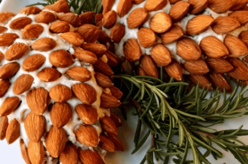 Garnish the finished dish with almonds and decorate with rosemary sprigs.