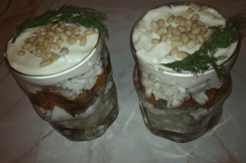 Layer in wide glasses: the bottom layer is potatoes (salted), followed by eggs, mushrooms and carrots, chicken fillet and mayonnaise. Top can be decorated with pine nuts and a sprig of dill.