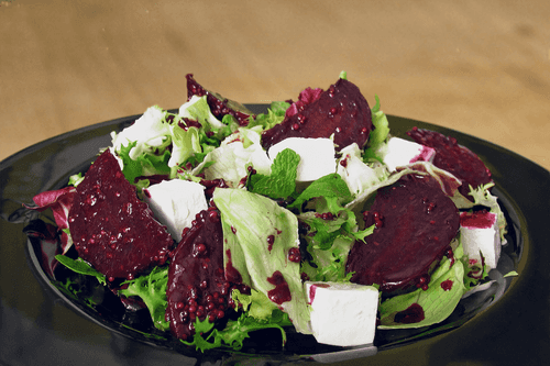 Mix the salad mix with mint leaves, add diced feta and slices of pickled beet.