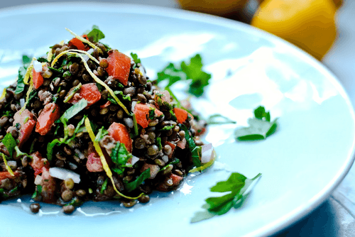 While the lentils are cooking, chop the tomatoes, onion, parsley, and mint and transfer them to a medium-sized bowl.