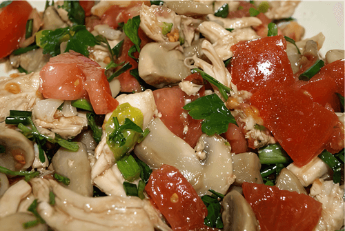 Cut tomatoes, fresh mushrooms, pickled cauliflower, and chicken.