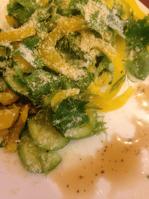 Arrange the meat in a circle on 4 serving plates, pile the salad on top, and grate Parmesan over it using a special grater or a vegetable peeler.