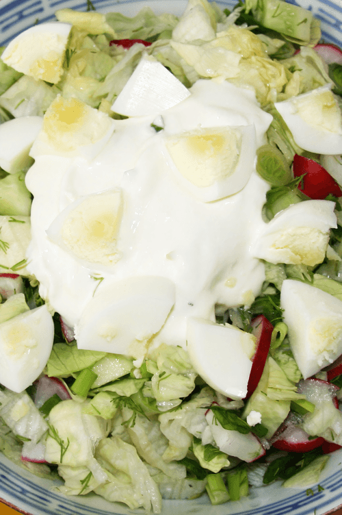 Spring salad with radishes, cucumbers, and eggs is a light and refreshing dish of Russian cuisine symbolizing the awakening of nature. Its bright colors and fresh taste are perfect for the first warm days. Crunchy radishes, juicy cucumbers, and tender boiled eggs create a harmonious combination, while green onions add zest. A light mayonnaise dressing binds the ingredients together, giving the salad softness. This salad is often prepared for family lunches and picnics, enjoyed for its simplicity and freshness. It pairs wonderfully with rye bread or meat dishes, making the meal rich and balanced.