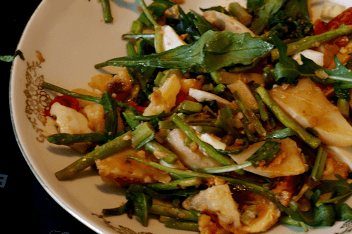 We chop half an avocado, a bunch of green onions, potatoes, asparagus, eggs, and add arugula.