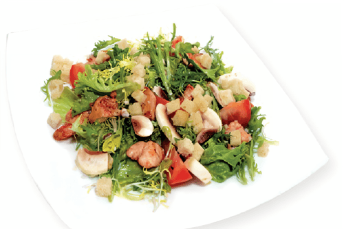 Roman salad with fresh mushrooms is a refined dish of Italian cuisine that embodies the freshness and lightness of the Mediterranean. Its history traces back to the traditions of Roman feasts where fresh ingredients were always in focus. Tender chicken fillet, juicy tomatoes, and white croutons give the salad a multifaceted texture while mushrooms add a subtle earthy aroma. Lettuce and Lolla Rossa leaves create a crispy base soaked in refreshing lemon dressing with olive oil. This dish is perfect for a light dinner or appetizer, delighting with a balance of flavors: light acidity, tender chicken taste, and earthy notes of mushrooms. Such a salad is not only nutritious but also elegant, highlighting Italian simplicity and sophistication.