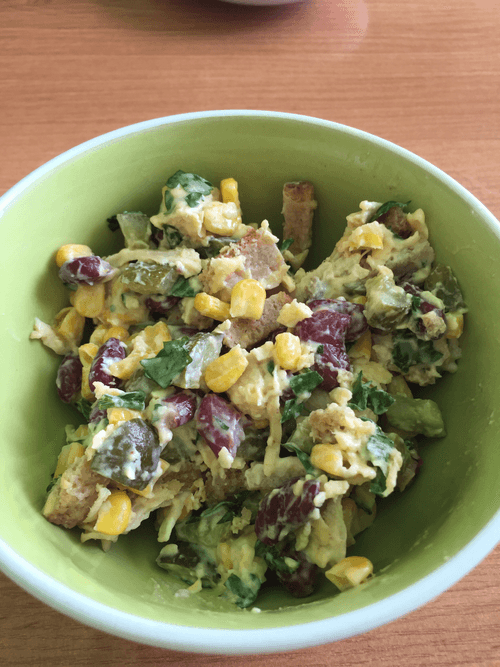 In a salad bowl, mix chicken fillet, beans, cheese, corn, pickled cucumbers, parsley, and garlic croutons from black bread, add yogurt, and mix the salad again.