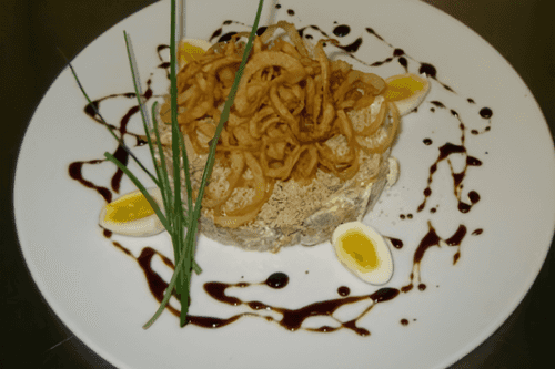 Mix everything with sautéed onions, grated walnuts, boiled chopped chicken eggs, and quality homemade thick mayonnaise.