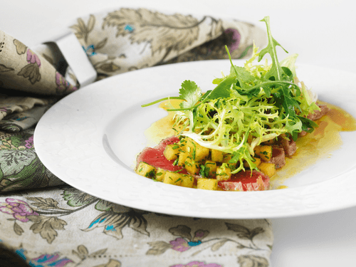 Arrange the tuna slices on plates. Drizzle with sauce. Add melon cubes. Finish the composition with a salad mix (arugula, radicchio, corn, frisée). If desired, season with salt and pepper.
