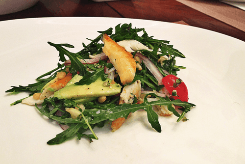 Mix all ingredients with arugula and add pine nuts.