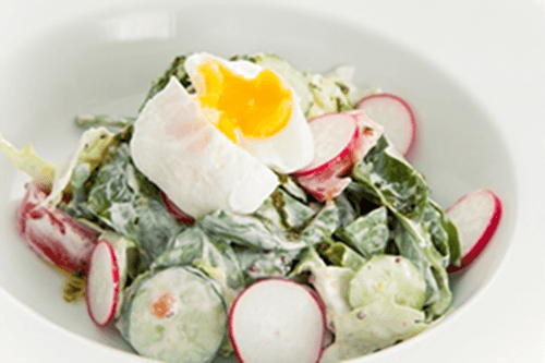 Spring salad with radish and poached egg is an exquisite dish of French cuisine that combines the freshness of spring vegetables with the tenderness of poached egg. The roots of this recipe trace back to France's gastronomic culture, where special attention is paid to the balance of flavors. Crunchy radish, sweet tomatoes, fresh cucumber, and aromatic roasted pepper create a harmonious blend. Tender lettuce leaves and green onions add lightness to the dish, while sour cream adds softness and a pleasant tang. A special highlight is the poached egg which, when spread out, makes the dish's texture rich and creamy. This salad is perfect as a light spring lunch or an elegant appetizer that emphasizes the delicacy of flavors and simplicity of preparation.