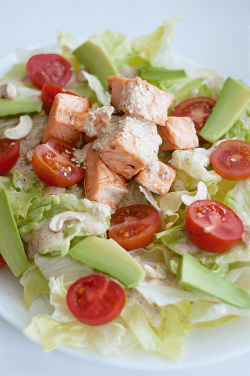 Lay out salad leaves, salmon, tomatoes, avocado, cashews, and drizzle with dressing.