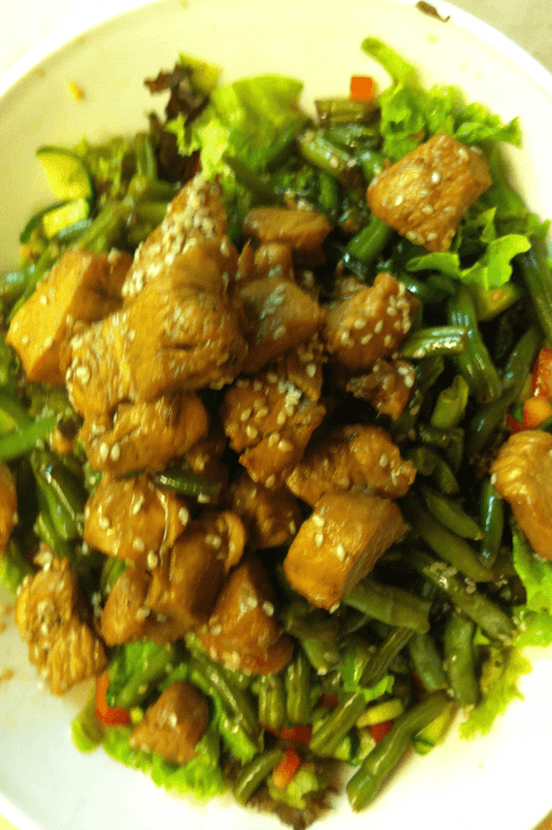 Warm salad with turkey and beans is a vibrant combination of flavors and textures inspired by American cuisine. Juicy turkey fillet fried to a golden crust, tender beans, and fresh vegetables create a rich and harmonious ensemble. The dressing made from teriyaki sauce, soy sauce, apple cider vinegar, and honey adds a spicy sweetness to the dish, while sesame adds a nutty note. This salad is perfect for a cozy family dinner or a light yet nutritious lunch. It not only delights the taste but also energizes with protein from turkey and vitamins from fresh vegetables. Served warm, making it especially comforting on cool days.