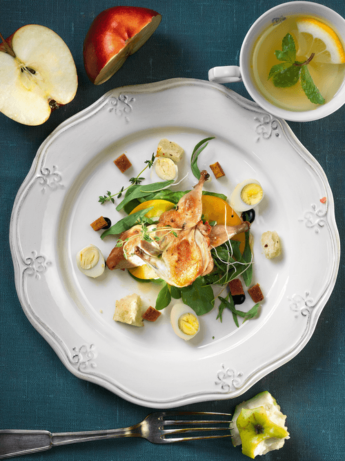 Drizzle a few drops of balsamic cream on the plate, arrange salad leaves, onion, persimmon slices, and tarragon leaves. Top with a fried quail and scatter croutons and halved eggs around.