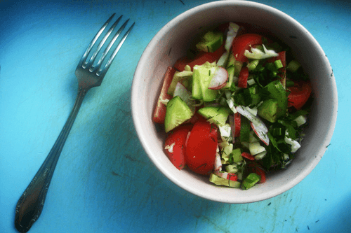 Chop the vegetables. Tomatoes - in wedges, cucumbers - in slices, celery stalk - finely, radishes - in slices.